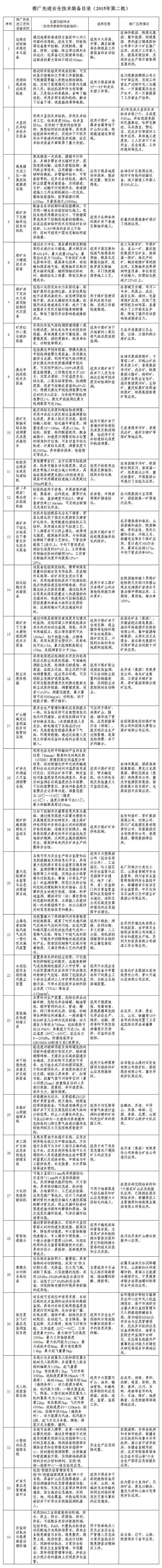 为加快先进安全技术装备的推广和应用,提升企业安全生产保障水平,增强防范和遏制重特大事故能力,根据《安全生产法》和《国家安全监管总局办公厅关于印发淘汰落后与推广先进安全技术装备目录管理办法的通知》(安监总厅科技〔2015〕43号),现予发布《推广先进安全技术装备目录(2015年第二批)》,请结合实际,积极组织应用和推广。