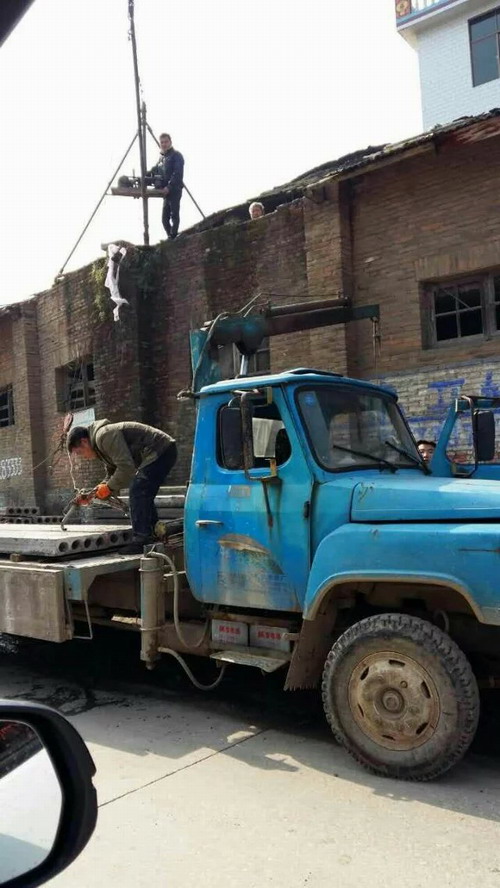 路边3米高的危墙上,有人正在使用机械吊起预制板。
